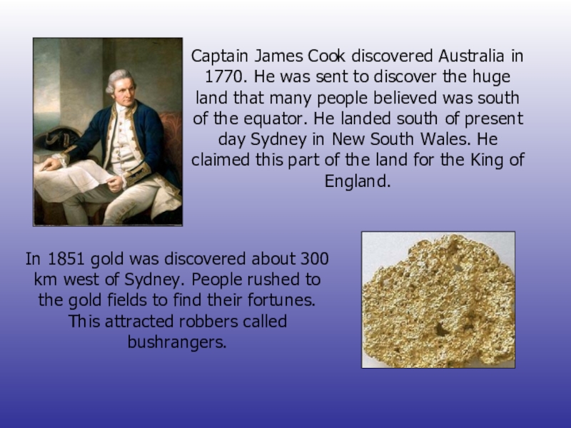 In 1851 gold was discovered about 300 km west of Sydney. People rushed to the gold fields to find their fortunes. This attracted robbers called bushrangers.