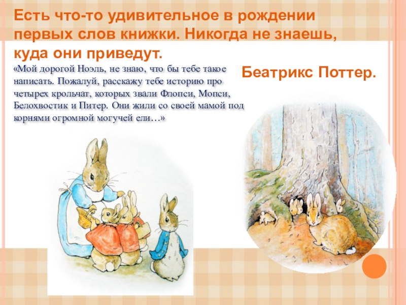 «Мой дорогой Ноэль, не знаю, что бы тебе такое написать. Пожалуй, расскажу тебе историю про четырех крольчат, которых звали Флопси, Мопси, Белохвостик и Питер. Они жили со своей мамой под корнями огромной могучей ели…»