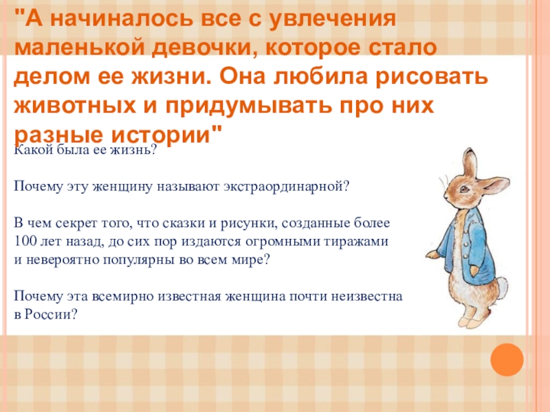 "А начиналось все с увлечения маленькой девочки, которое стало делом ее жизни. Она любила рисовать животных и придумывать про них разные истории"