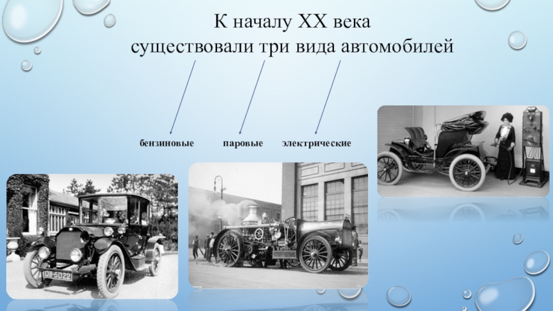 К началу XX века существовали три вида автомобилейбензиновыепаровыеэлектрические