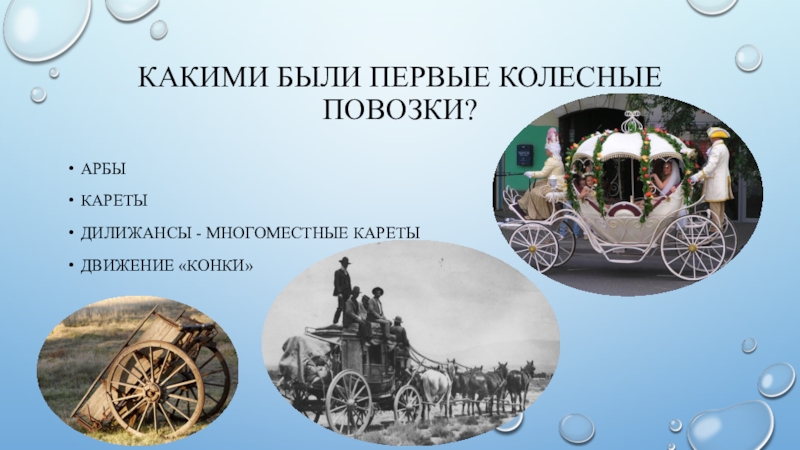 Какими были первые колесные повозки?АрбыКаретыДилижансы - многоместные каретыдвижение «конки»