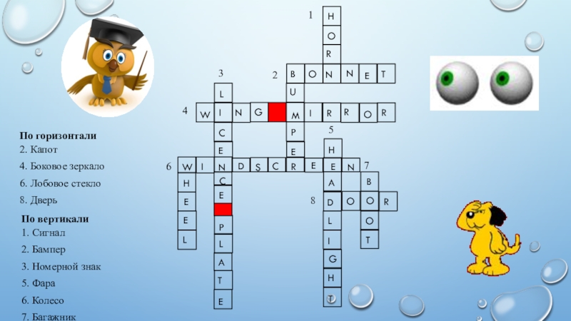 12345678OHRNBONTEUMPERWINGIRRROLCENCELPATEWEELHIDSCEENHADLIGHTOOROTBПо горизонтали2. Капот4. Боковое зеркало6. Лобовое стекло8. ДверьПо вертикали1. Сигнал2. Бампер3. Номерной знак5. Фара6. Колесо7. Багажник