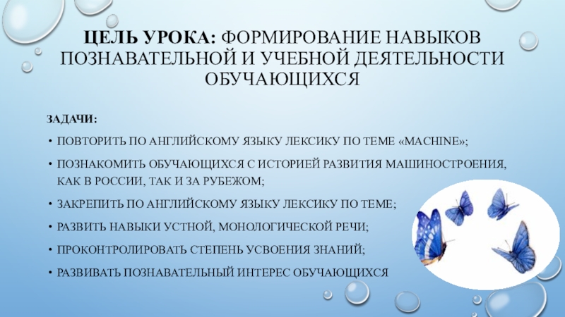 Цель урока: формирование навыков познавательной и учебной деятельности обучающихся Задачи:Повторить по английскому языку лексику по теме «Machine»;Познакомить обучающихся с историей развития машиностроения, как в России, так и за рубежом;Закрепить по английскому языку лексику по теме;Развить навыки