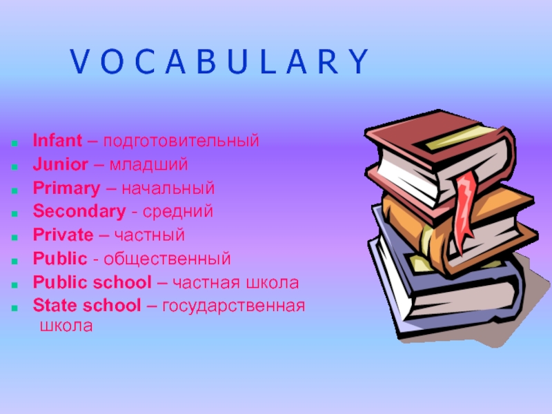 V O C A B U L A R YInfant – подготовительныйJunior – младшийPrimary – начальныйSecondary - среднийPrivate – частныйPublic - общественныйPublic school – частная школаState school – государственная школа