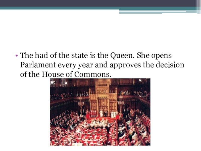 Слайд 6The had of the state is the Queen. She opens Parlament