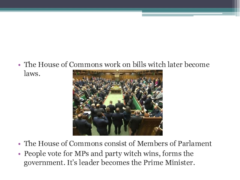 Слайд 3The House of Commons work on bills witch later become laws.
