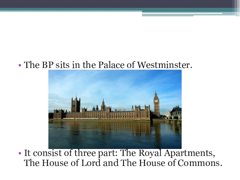 The BP sits in the Palace of Westminster.It consist of three part: The Royal Apartments, The House of Lord and The House of Commons.