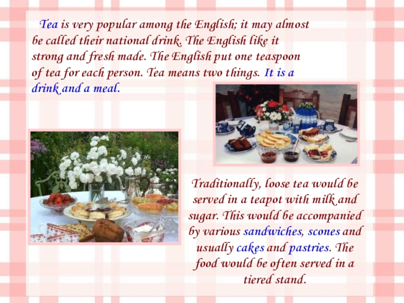 Traditionally, loose tea would be served in a teapot with milk and sugar. This would be accompanied by various sandwiches, scones and usually cakes and pastries. The food would be often served in a tiered stand.