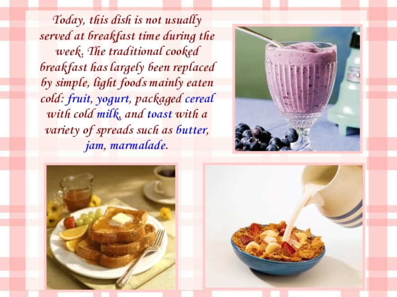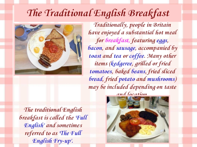 The traditional English breakfast is called the 'Full English' and sometimes referred to as 'The Full English Fry-up'.
