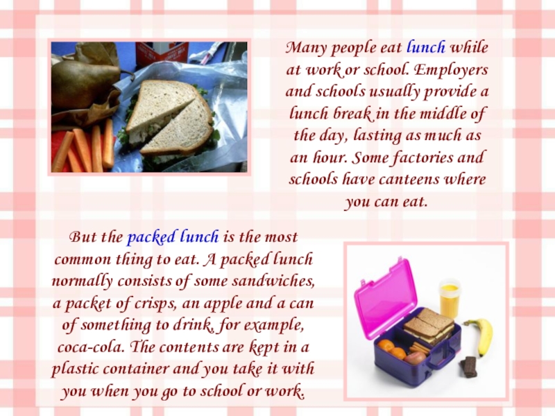 Many people eat lunch while at work or school. Employers and schools usually provide a lunch break in the middle of the day, lasting as much as an hour. Some factories and schools have canteens where you can eat.