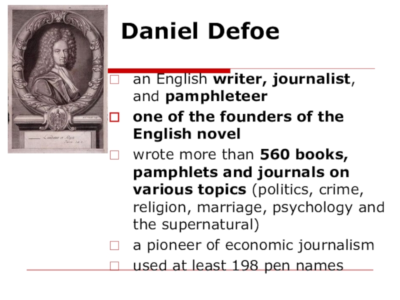 Daniel Defoe an English writer, journalist, and pamphleteerone of the founders of the English novel wrote more than 560 books, pamphlets and journals on various topics (politics, crime, religion, marriage, psychology and the supernatural)a pioneer of