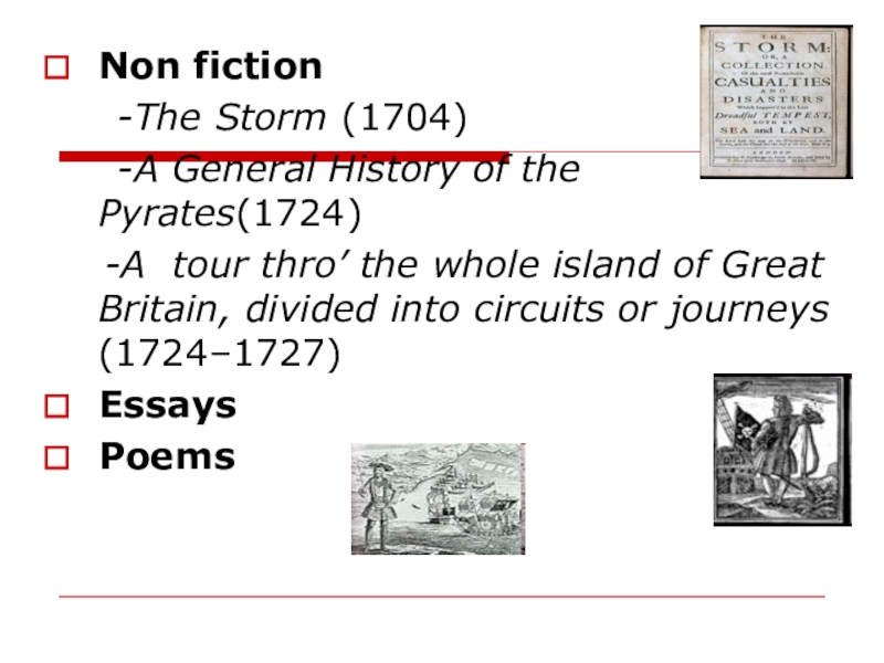 Non fiction   -The Storm (1704)   -A General History of the Pyrates(1724)  -A