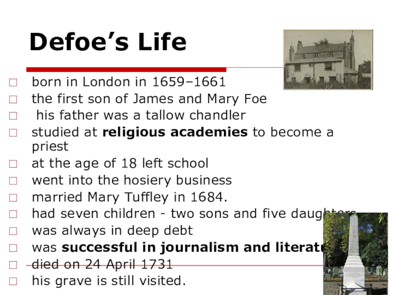 Презентация, доклад по английскому языку British writers. Daniel Defoe ( 7 класс)