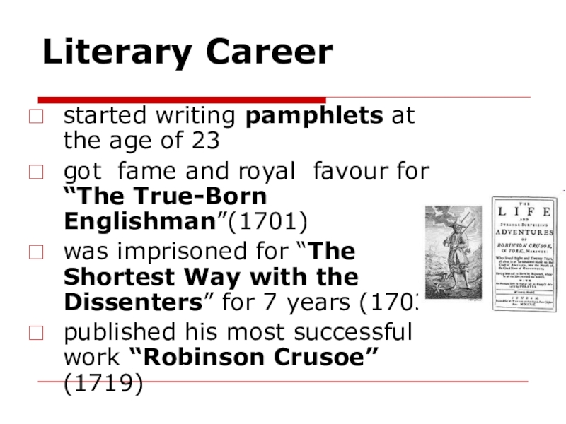 Literary Careerstarted writing pamphlets at the age of 23got fame and royal favour for “The True-Born Englishman”(1701)