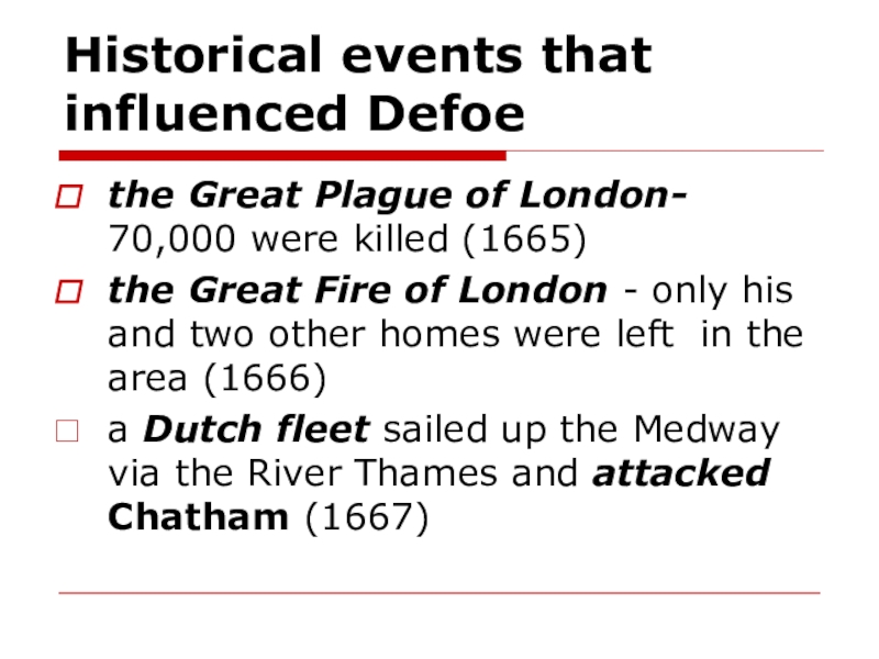 Historical events that influenced Defoethe Great Plague of London- 70,000 were killed (1665)the Great Fire of London