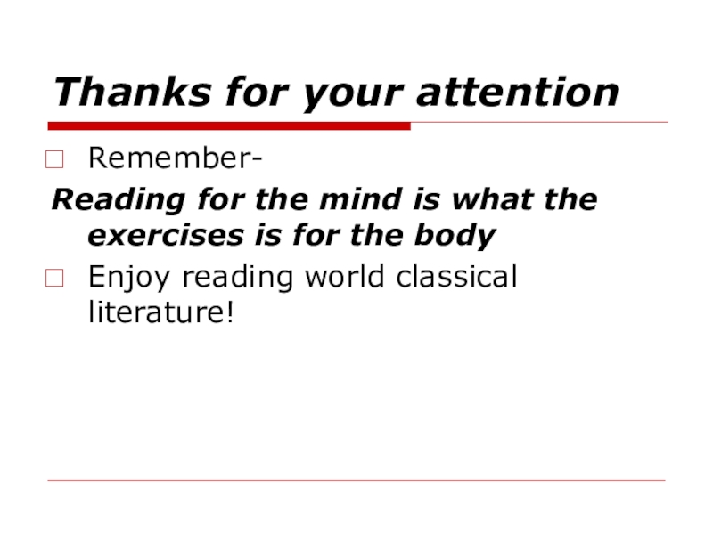 Thanks for your attentionRemember-Reading for the mind is what the exercises is for the bodyEnjoy reading world