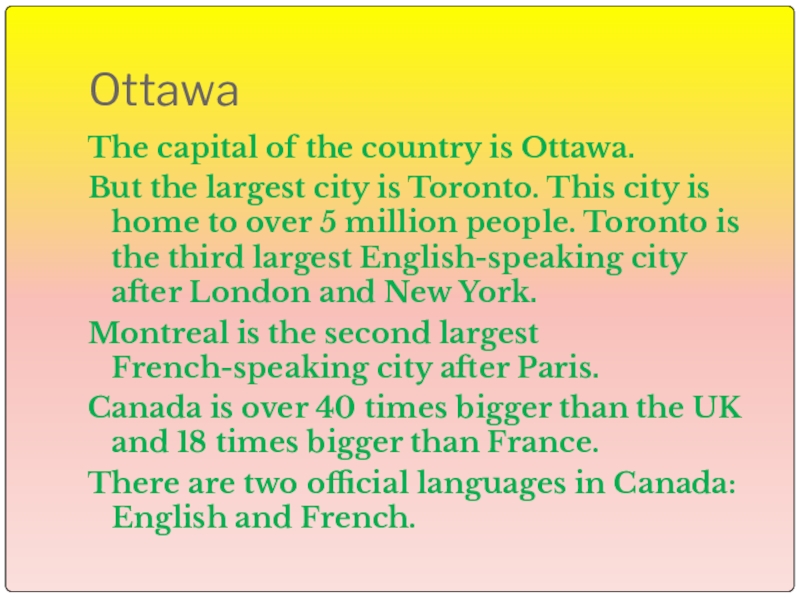 Toronto. This city is home to over 5 million people. Toronto is the third largest English-speaking city after London and New York.