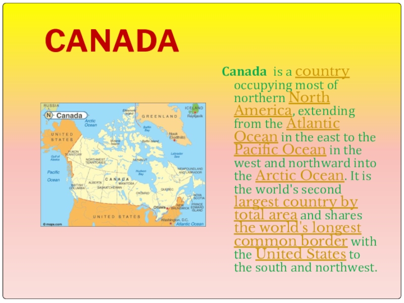 from the Atlantic Ocean in the east to the Pacific Ocean in the west and northward into the Arctic Ocean. It is the world's second largest country by total area and shares the world's longest common border with the United States to the south and northwest.