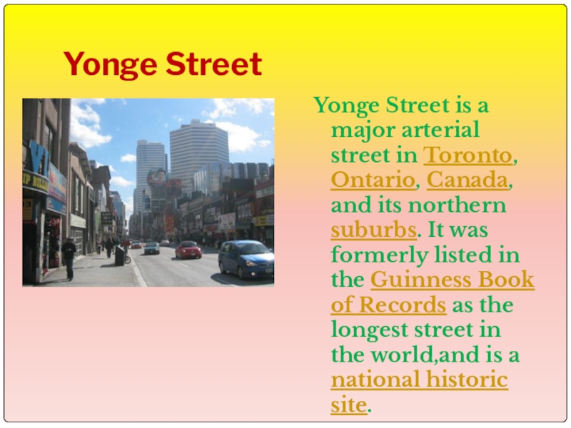 Canada, and its northern suburbs. It was formerly listed in the Guinness Book of Records as the longest street in the world,and is a national historic site.