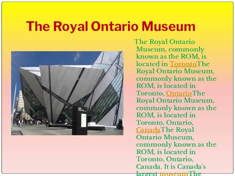 as the ROM, is located in TorontoThe Royal Ontario Museum, commonly known as the ROM, is located in Toronto, OntarioThe Royal Ontario Museum, commonly known as the ROM, is located in Toronto, Ontario, CanadaThe Royal Ontario Museum, commonly known as the ROM, is located in Toronto, Ontario, Canada. It is Canada's largest museumThe Royal Ontario Museum, commonly known as the ROM, is located in Toronto, Ontario, Canada. It is Canada's largest museum of world cultureThe Royal Ontario Museum, commonly known as the ROM, is located in Toronto, Ontario, Canada. It is Canada's largest museum of world culture and natural historyThe Royal Ontario Museum, commonly known as the ROM, is located in Toronto, Ontario, Canada. It is Canada's largest museum of world culture and natural history. The ROM is the fifth largest museum in North AmericaThe Royal Ontario Museum, commonly known as the ROM, is located in Toronto, Ontario, Canada. It is Canada's largest museum of world culture and natural history. The ROM is the fifth largest museum in North America, containing more than six million items and over 40 galleries. It has notable collections of dinosaursThe Royal Ontario Museum, commonly known as the ROM, is located in Toronto, Ontario, Canada. It is Canada's largest museum of world culture and natural history. The ROM is the fifth largest museum in North America, containing more than six million items and over 40 galleries. It has notable collections of dinosaurs, Near EasternThe Royal Ontario Museum, commonly known as the ROM, is located in Toronto, Ontario, Canada. It is Canada's largest museum of world culture and natural history. The ROM is the fifth largest museum in North America, containing more than six million items and over 40 galleries. It has notable collections of dinosaurs, Near Eastern and African artThe Royal Ontario Museum, commonly known as the ROM, is located in Toronto, Ontario, Canada. It is Canada's largest museum of world culture and natural history. The ROM is the fifth largest museum in North America, containing more than six million items and over 40 galleries. It has notable collections of dinosaurs, Near Eastern and African art, East Asian artThe Royal Ontario Museum, commonly known as the ROM, is located in Toronto, Ontario, Canada. It is Canada's largest museum of world culture and natural history. The ROM is the fifth largest museum in North America, containing more than six million items and over 40 galleries. It has notable collections of dinosaurs, Near Eastern and African art, East Asian art, European historyThe Royal Ontario Museum, commonly known as the ROM, is located in Toronto, Ontario, Canada. It is Canada's largest museum of world culture and natural history. The ROM is the fifth largest museum in North America, containing more than six million items and over 40 galleries. It has notable collections of dinosaurs, Near Eastern and African art, East Asian art, European history, and Canadian history. It has also hosted many travelling exhibits. The museum engages over 700 000 visitors each year.