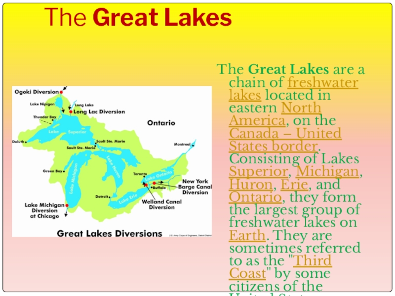 located in eastern North America, on the Canada – United States border. Consisting of Lakes Superior, Michigan, Huron, Erie, and Ontario, they form the largest group of freshwater lakes on Earth. They are sometimes referred to as the "Third Coast" by some citizens of the United States. Because of their size, some regard them as inland seas.