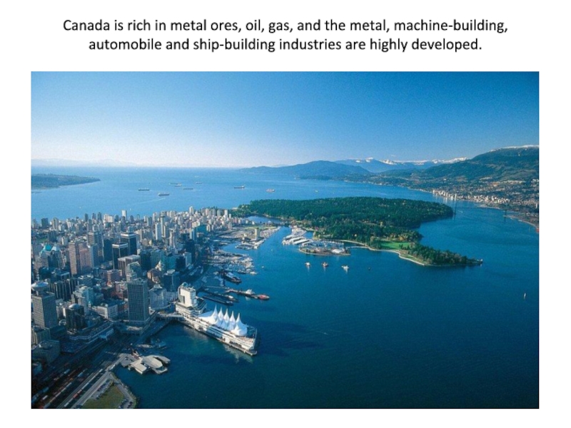 Canada is rich in metal ores, oil, gas, and the metal, machine-building, automobile and ship-building industries are