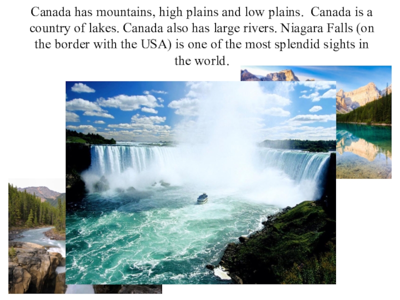 country of lakes. Canada also has large rivers. Niagara Falls (on the border with the USA) is one of the most splendid sights in the world.