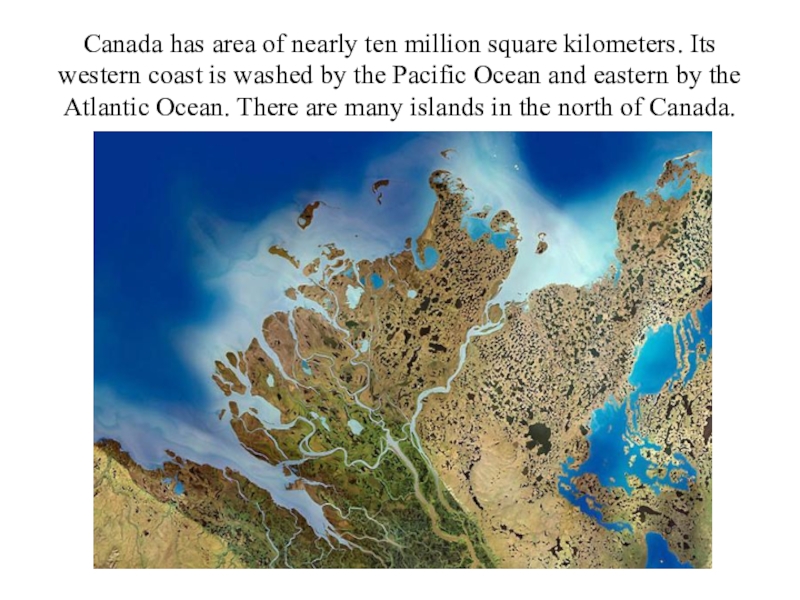 Canada has area of nearly ten million square kilometers. Its western coast is washed by the Pacific Ocean and eastern by the Atlantic Ocean. There are many islands in the north of Canada.
