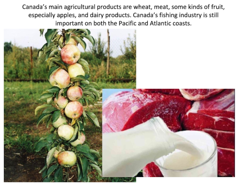Слайд 8Canada’s main agricultural products are wheat, meat, some kinds of fruit,