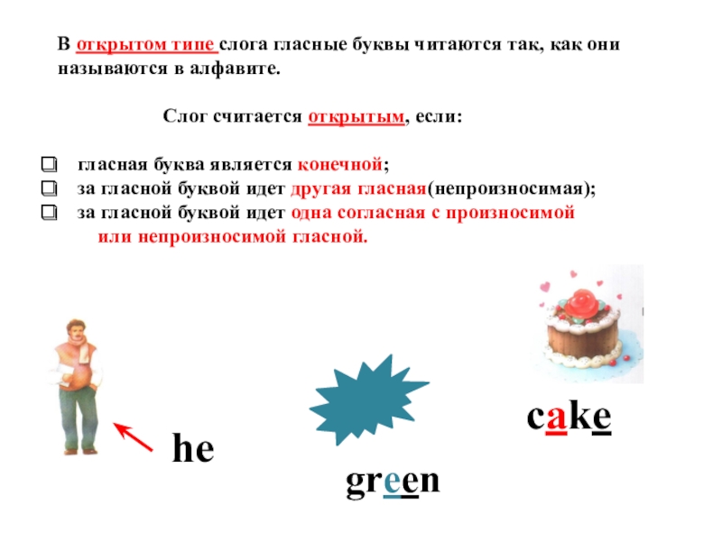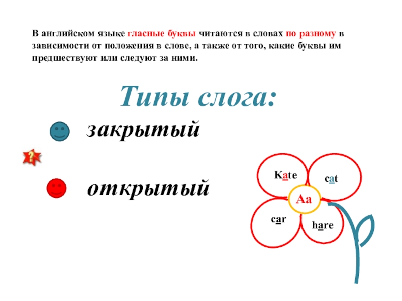 В английском языке гласные буквы читаются в словах по разному в зависимости от положения в слове, а также от того, какие буквы им предшествуют или следуют за ними.