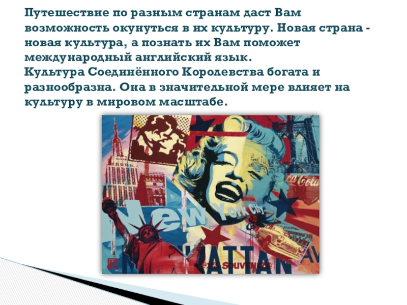 Слайд 7Путешествие по разным странам даст Вам возможность окунуться в их культуру.