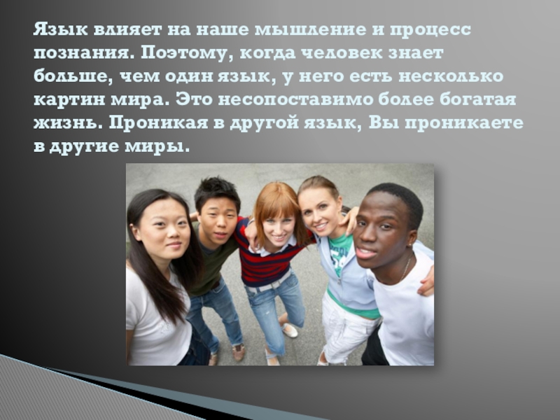 Слайд 13Язык влияет на наше мышление и процесс познания. Поэтому, когда человек