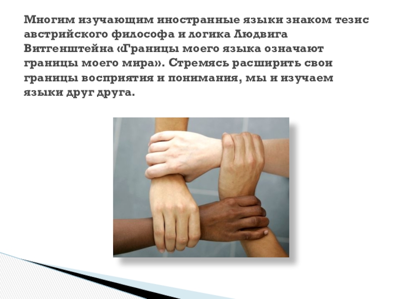 Слайд 14Многим изучающим иностранные языки знаком тезис австрийского философа и логика Людвига Витгенштейна