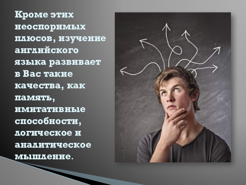 Слайд 12Кроме этих неоспоримых плюсов, изучение английского языка развивает в Вас такие