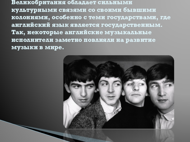 теми государствами, где английский язык является государственным. Так, некоторые английские музыкальные исполнители заметно повлияли на развитие музыки в мире.