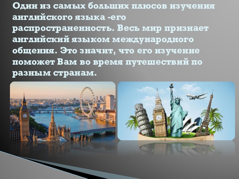 мир признает английский языком международного общения. Это значит, что его изучение поможет Вам во время путешествий по разным странам.