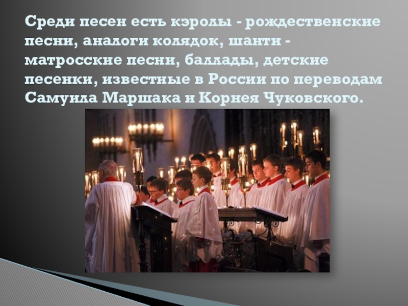 Слайд 11Среди песен есть кэролы - рождественские песни, аналоги колядок, шанти -