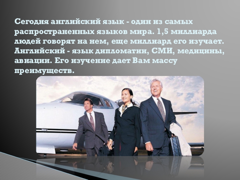 миллиарда людей говорят на нем, еще миллиард его изучает. Английский - язык дипломатии, СМИ, медицины, авиации. Его изучение дает Вам массу преимуществ.