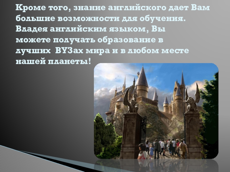 Слайд 4Кроме того, знание английского дает Вам большие возможности для обучения. Владея