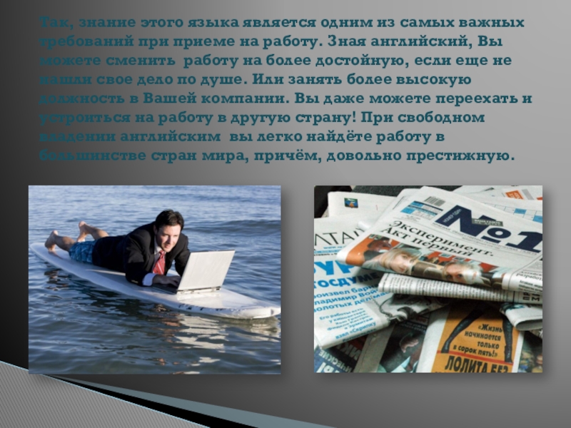 приеме на работу. Зная английский, Вы можете сменить работу на более достойную, если еще не нашли свое дело по душе. Или занять более высокую должность в Вашей компании. Вы даже можете переехать и устроиться на работу в другую страну! При свободном владении английским вы легко найдёте работу в большинстве стран мира, причём, довольно престижную.