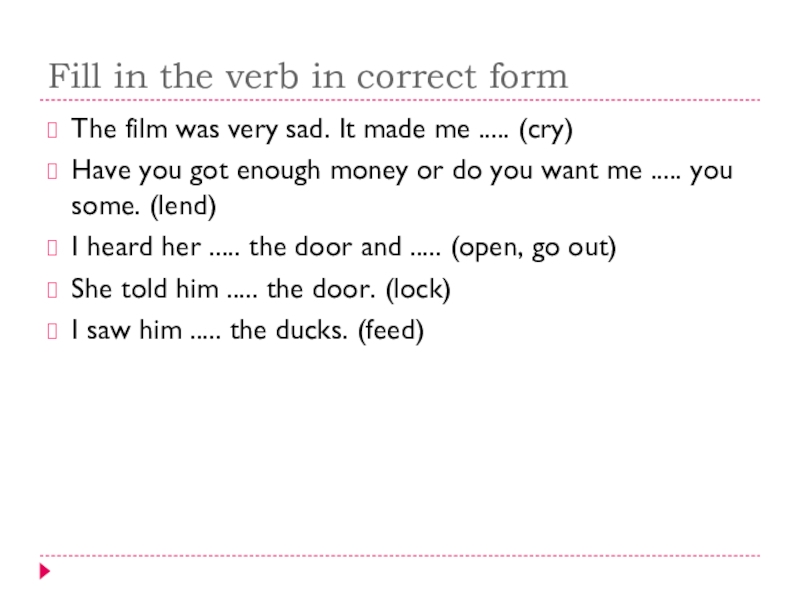 Fill in the verb in correct formThe film was very sad. It made me ..... (cry)Have you