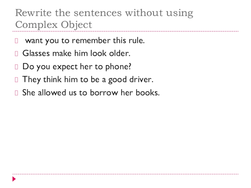 Rewrite the sentences without using Complex Object want you to remember this rule.Glasses make him look older.Do you