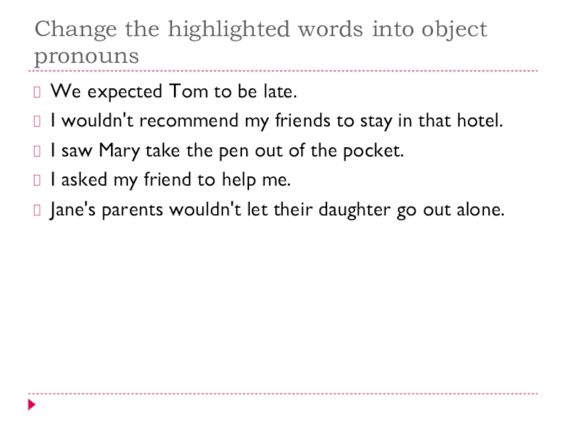 Change the highlighted words into object pronounsWe expected Tom to be late.I wouldn't recommend my friends to stay in that hotel.I