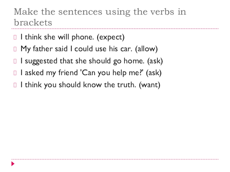 Make the sentences using the verbs in brackets I think she will phone. (expect)My father said I could use his car. (allow)I suggested that she should go home. (ask)I asked my friend 'Can you help me?'