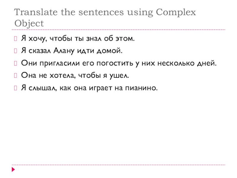 Translate the sentences using Complex ObjectЯ хочу, чтобы ты знал об этом.Я сказал Алану идти домой.Они пригласили