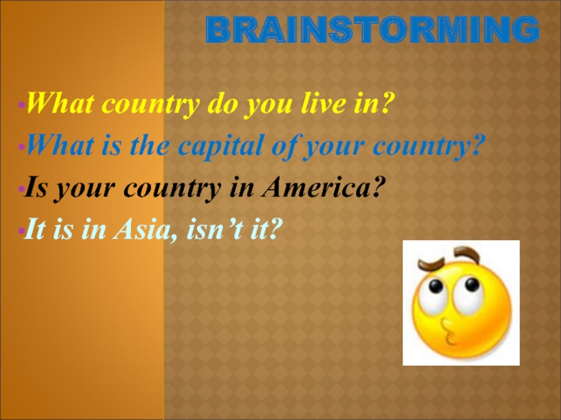 BRAINSTORMING What country do you live in?What is the capital of your country?Is your country in America?It is in Asia, isn’t it?