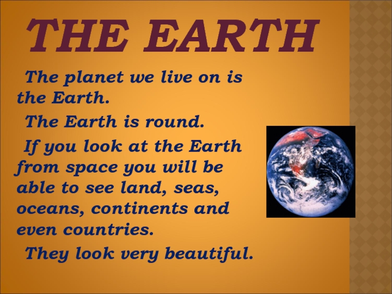 THE EARTH	The planet we live on is the Earth. 	The Earth is round. 	If you look at