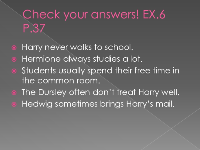 Check your answers! EX.6 P.37Harry never walks to school.Hermione always studies a lot.Students usually spend their free
