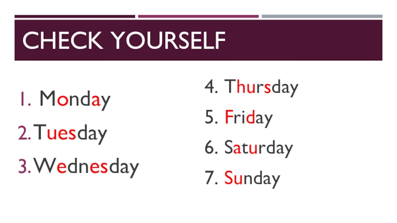 Check yourself MondayTuesdayWednesday 4. Thursday5. Friday6. Saturday7. Sunday