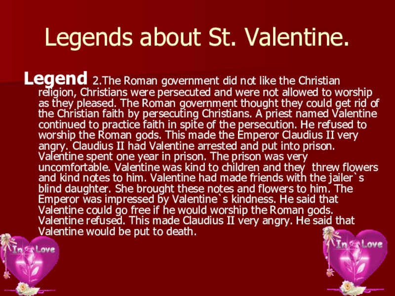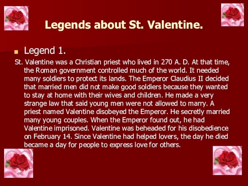 St. Valentine was a Christian priest who lived in 270 A. D. At that time, the Roman government controlled much of the world. It needed many soldiers to protect its lands. The Emperor Claudius II decided that married men did not make good soldiers because they wanted to stay at home with their wives and children. He made a very strange law that said young men were not allowed to marry. A priest named Valentine disobeyed the Emperor. He secretly married many young couples. When the Emperor found out, he had Valentine imprisoned. Valentine was beheaded for his disobedience on February 14. Since Valentine had helped lovers, the day he died became a day for people to express love for others.